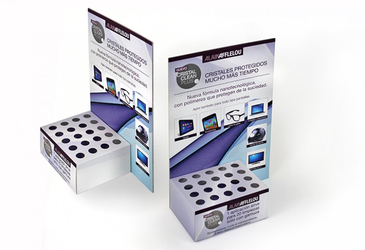 Pueden estar troquelados con formas, disponer de porta-folletos u otros elementos; para mostrador o escaparate.